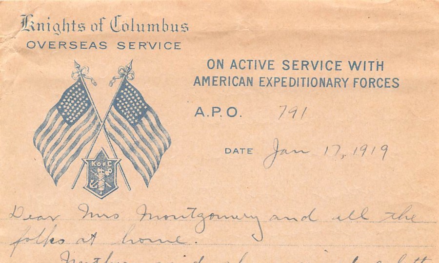 [Envelope with Knights of Columbus return address box, “Soldiers Mail” penciled in upper right corner, “OK Censor” and signature and seal in lower left corner, addressed to Mrs. W.J. Montgomery, Marion, S.C. postmarked Jan 20, 1919, forwarded to St. George Hotel, St. Augustine, Fla. Postmark Feb 20, 1919.]