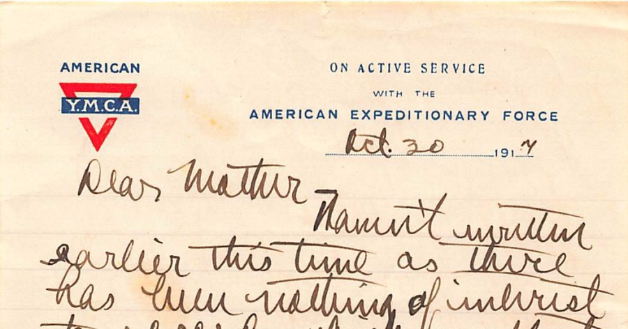 The tight security fits against a background of the sinking of the Lusitania two years earlier and several recent incidents of sabotage, including two in New Jersey, all of which contributed to heightened tension and ultimately the US entry into the war in April 1917. Germany pursued a desperate policy of unrestricted submarine warfare, an immediate cause of the US entry into the war but also a reason to restrict information about troop movements. The RMS Carpathia leaves port in a convoy of fourteen transport ships with cruiser escort. This configuration changes a day or two out of his destination. “Our destroyer escort met us yesterday afternoon and I think everybody felt better to see them coming over the horizon. …now that we are in the real submarine zone, all protection is welcome and the destroyer comforting.”