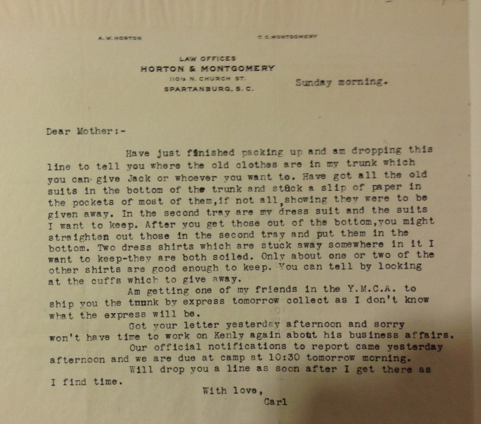 As the correspondence from his military career begins, Monty is 28 and about to be commissioned a second lieutenant in the US Army Reserve. He has just wrapped up his law practice as Horton & Montgomery in Spartanburg, SC where he had previously spent time in a noted firm Bomar & Osborne that employed Wofford graduates before he went out on his own for a brief year. After college he taught for a year, dabbled with law at his father’s office and then went on to Harvard Law where he graduated in 1914. He was nurturing a solo law practice when the United States declared war on Germany and the mobilization was underway; then he was closing down his fledgling practice in anticipation of the draft.