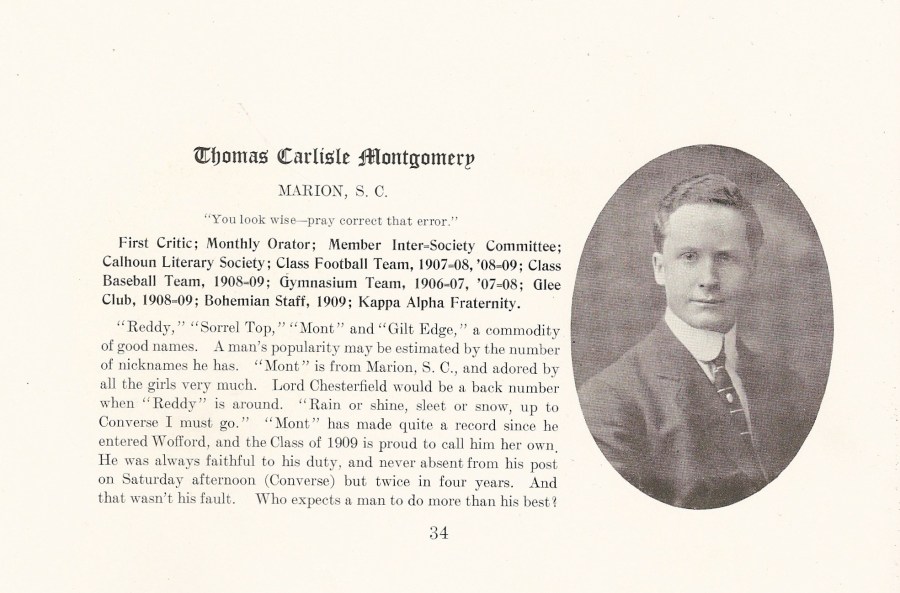 Thomas Carlisle Montgomery was born in Marion, SC in 1889. His parents were a lawyer-banker-businessman and the privately educated daughter of a Confederate colonel. His life began in a household with three sisters and the fading memory of his two year old brother who died four months before. His father chose the name Carlisle, apparently in deference to a revered and influential professor James Henry Carlisle from his own undergraduate days at Wofford College. His son Carl, as they would call him, graduated from Wofford 34 years after his father in 1909, surviving classes taught by the same J.H. Carlisle. Except to his immediate family, Carl in his adult life would be known as “Monty.” Even the nieces and nephews knew him as “Uncle Monty,” and that moniker never applied to another Montgomery family member. A Hallmark card with no date (but clearly from a later time of life) begins with Hallmark’s choice of greeting—“Happy Anniversary to the Girl I married…” and concludes several pages later with his only effort at personalization–a five-letter addition: “Monty.”